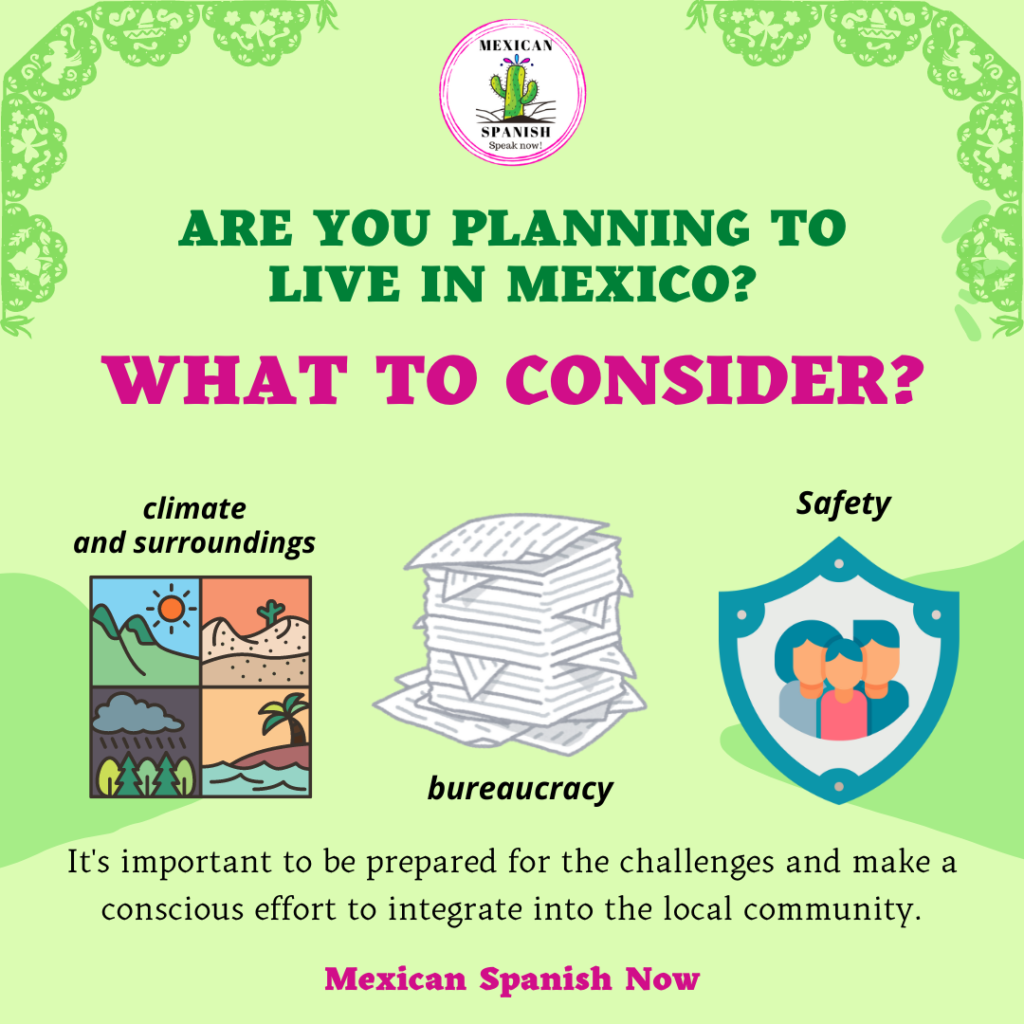 Vivir en México tiene sus desafíos. La barrera del idioma puede ser un obstáculo, ya que, aunque en áreas turísticas se habla inglés pero incluso ahí no todas las personas se podrán comunicar en este idioma, aprender español es crucial para una integración completa y más oportunidades. La seguridad es otra preocupación, siendo esencial investigar y elegir áreas seguras para vivir y estar siempre consciente del entorno. Finalmente la burocracia mexicana puede ser frustrante, con trámites para visas y permisos de trabajo que pueden ser lentos y complicados, es necesario investigar bien antes de realmente hacer la mudanza, cuales son los requisitos para una visa, y mucho cuidado si quieres contratar los servicios de alguien asegúrate siempre de tener referencias antes de cualquier anticipo o pago. Elegir el lugar será otro factor a considerar, te vamos a contar más en otra entrada pero siempre considera que es lo que quieres, México es enorme, algunos lugares tienen comunidades de expatriados en ciudades como Ciudad de México, Guadalajara y Mérida, que pueden ofrecer apoyo y facilitar la adaptación, pero no así en pueblos pequeños.
